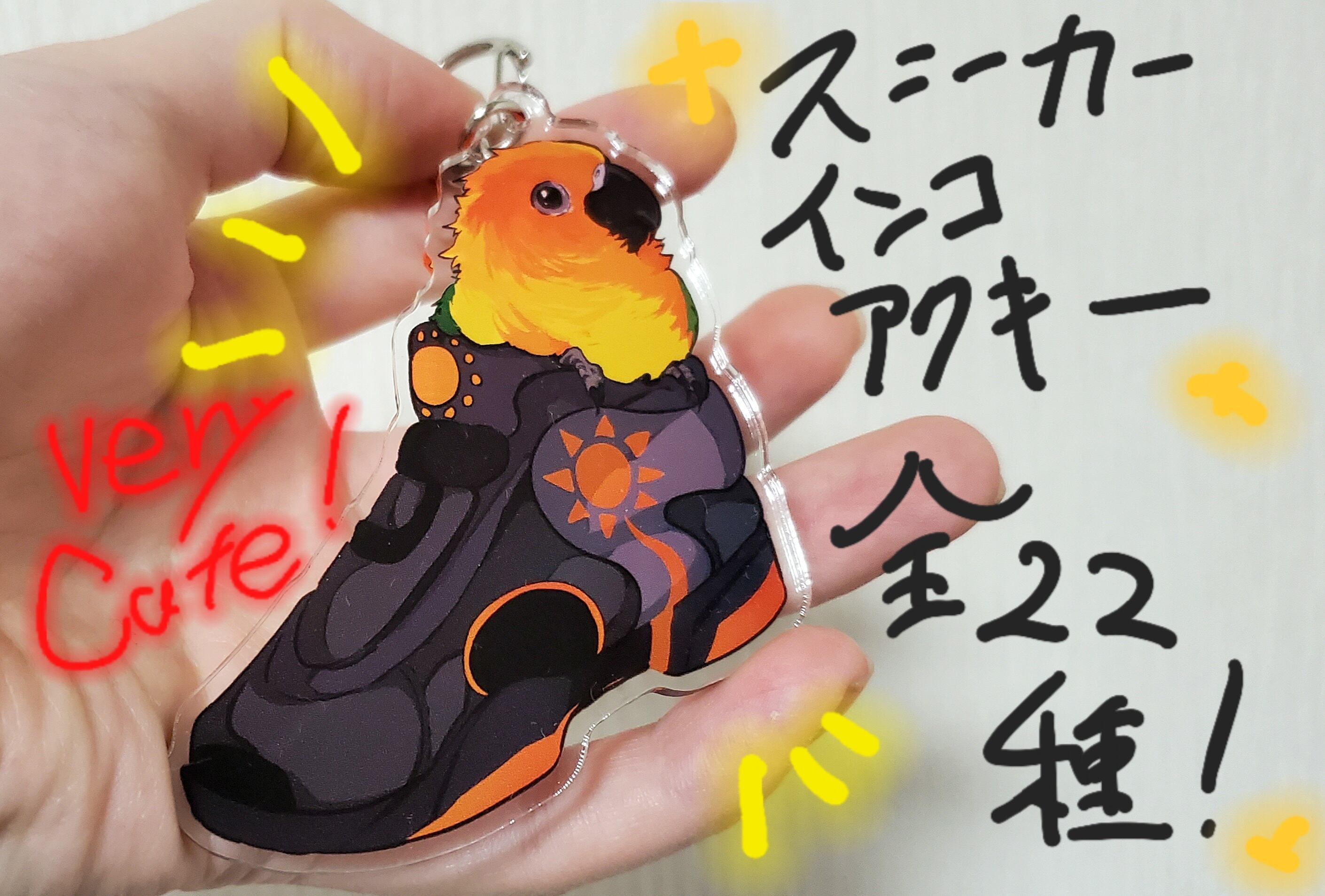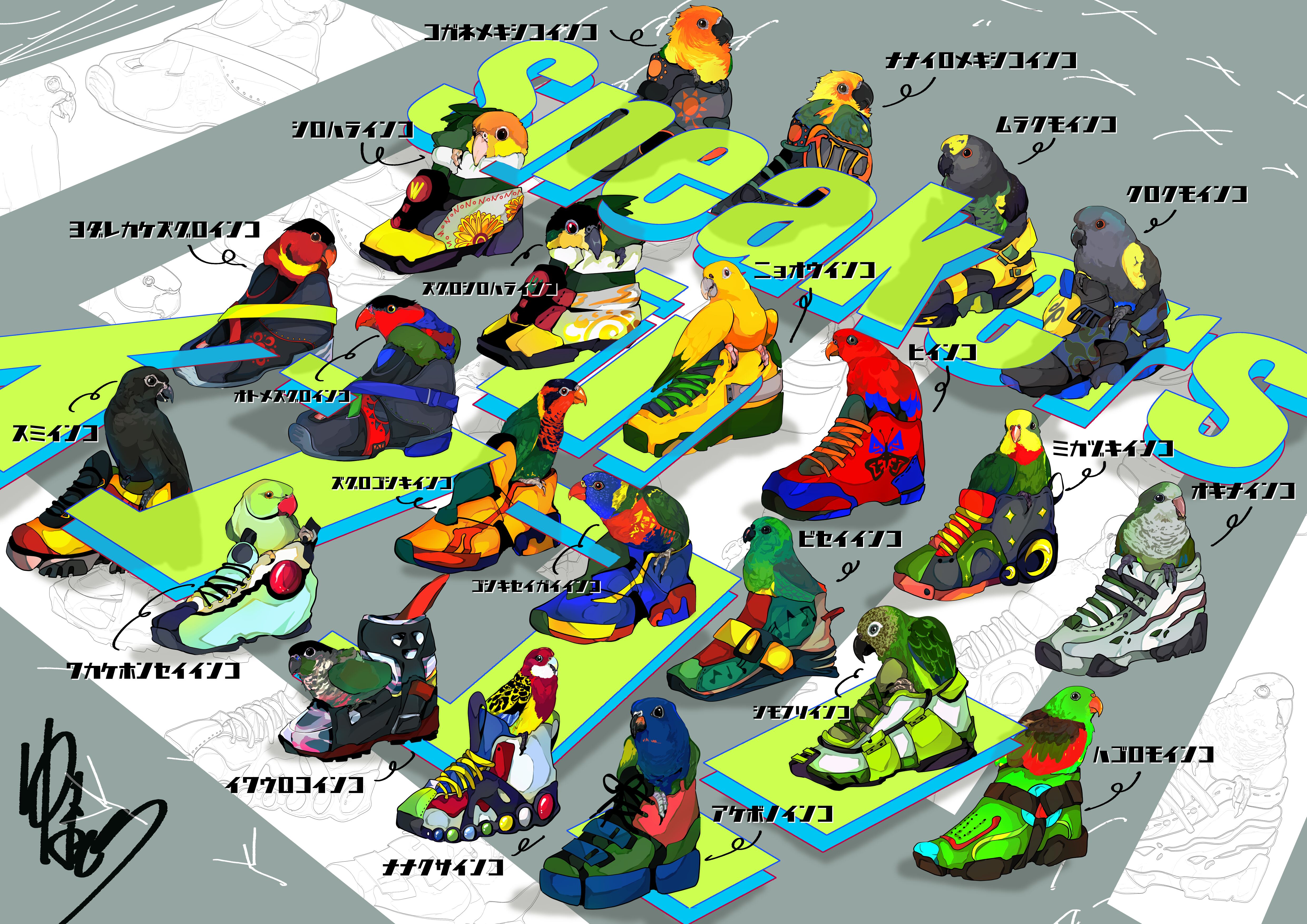 スニーカーもそれぞれのインコ達をイメージしてデザインしました